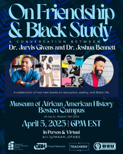 Chris Walkes, IRT ’17 Director of Education and Interpretation at the Museum of African American History in Boston, MA moderated a discussion entitled, On Friendship & Black Study, between authors and friends Drs. Jarvis Givens and Joshua Bennett. In this public discussion, they focused on their personal friendship as colleagues and the importance of Black Studies as a discipline and needed part of university curricula.
